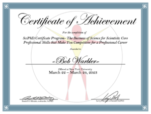 When you’re ready, take the Business of Science Certification Exam. Upon successful completion, you’ll earn the official SciPhD Certificate of Achievement and gain no-cost access to:
